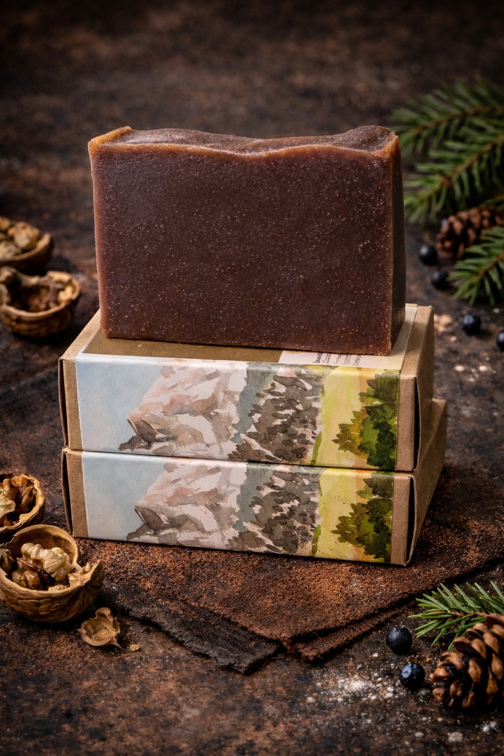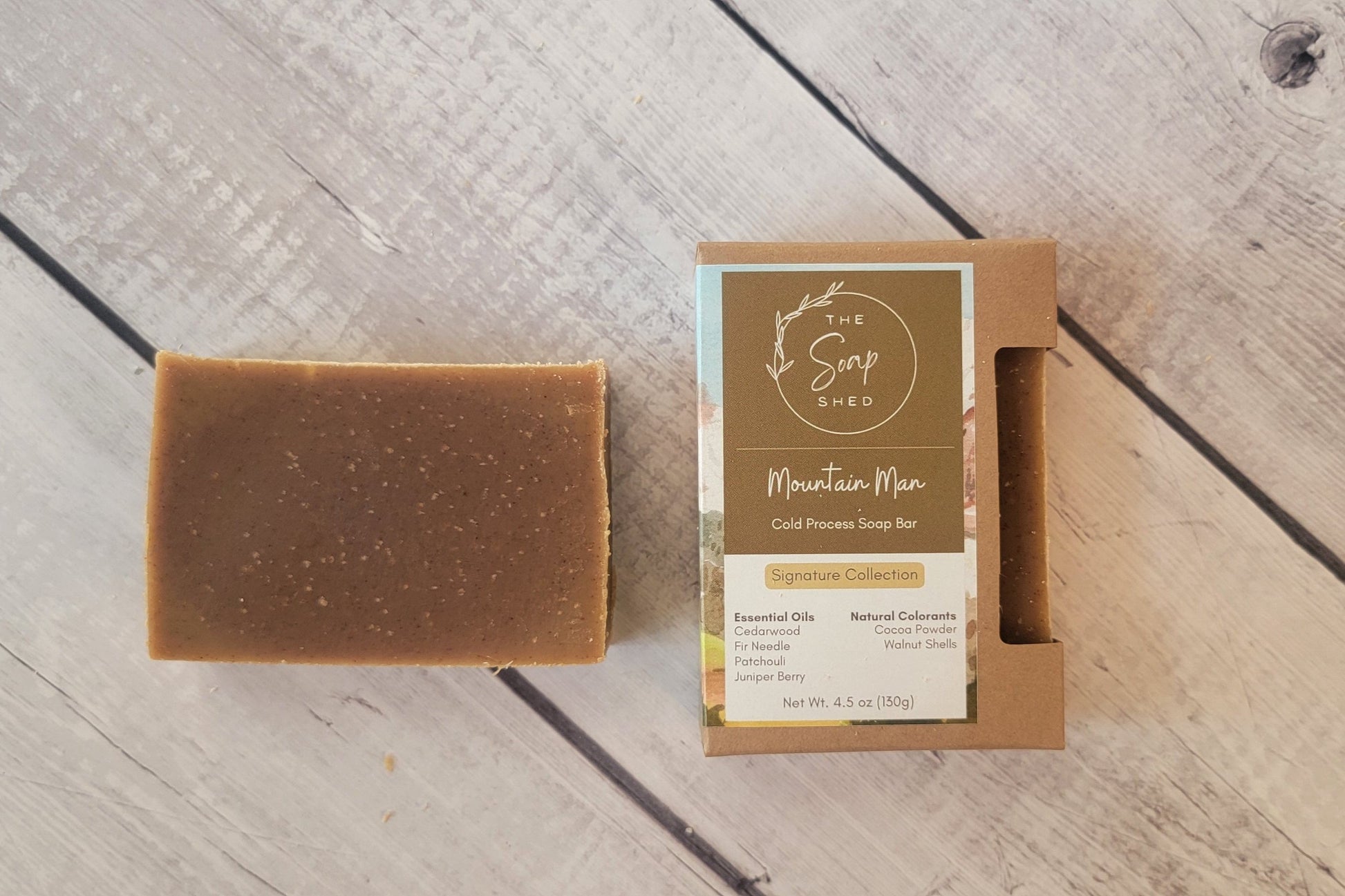 Immerse yourself in the rugged essence of the wilderness with our Mountain Man Cold Process Soap Bar. Crafted with the finest all-natural ingredients, this soap is scented with a robust blend of cedar wood atlas, fir needle, patchouli, and juniper berry essential oils, offering a bold and invigorating aroma. Naturally colored with cocoa powder and walnut shells, each bar features a rich, earthy hue and gentle exfoliating properties. Enriched with coconut milk, Mountain Man provides a creamy lather and nourishing cleanse suitable for all skin types. Embrace the adventurous spirit and natural simplicity of Mountain Man Cold Process Soap Bar, and let every wash transport you to the heart of the mountains.