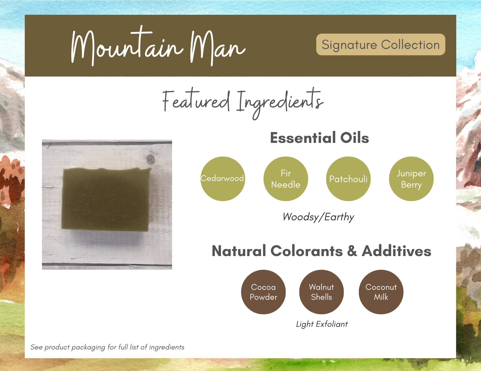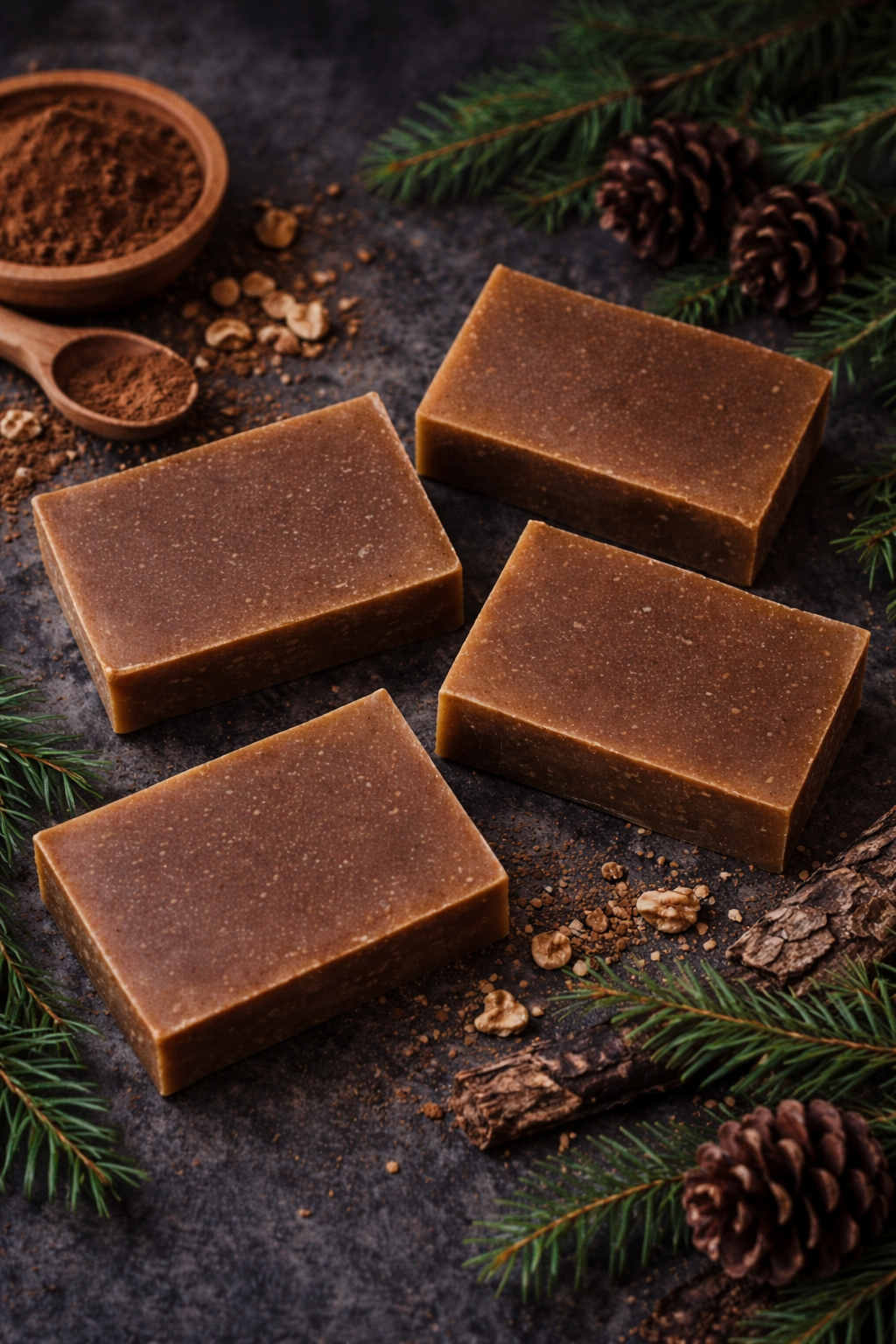 Ingredient listing: olive oil, coconut oil, coconut milk, distilled water, sodium hydroxide, cocoa butter, shea butter, mango seed butter, castor oil, essential oil blend (cedarwood atlas, fir needle, patchouli, juniper berry), walnut shells, cocoa powder